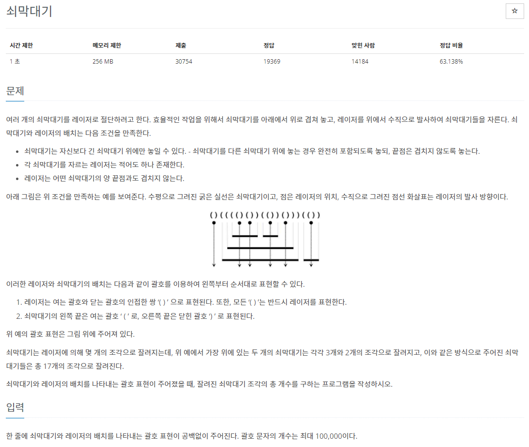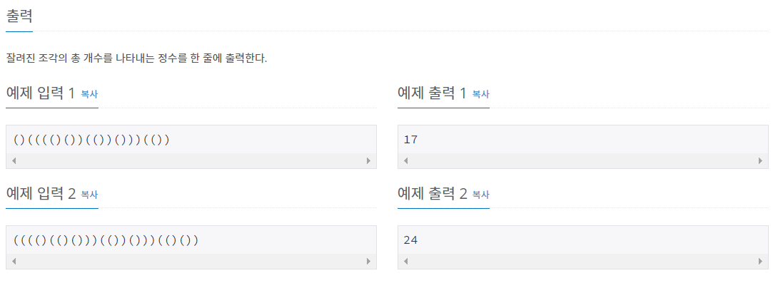 cnt 변수는 레이저와 쇠막대기를 구분하기 위해 써주었다. cnt 가 0일때 ')' 가 오면 레이저, cnt가 1일 때 ')' 가 오면 쇠막대기로 인식하게 했다.