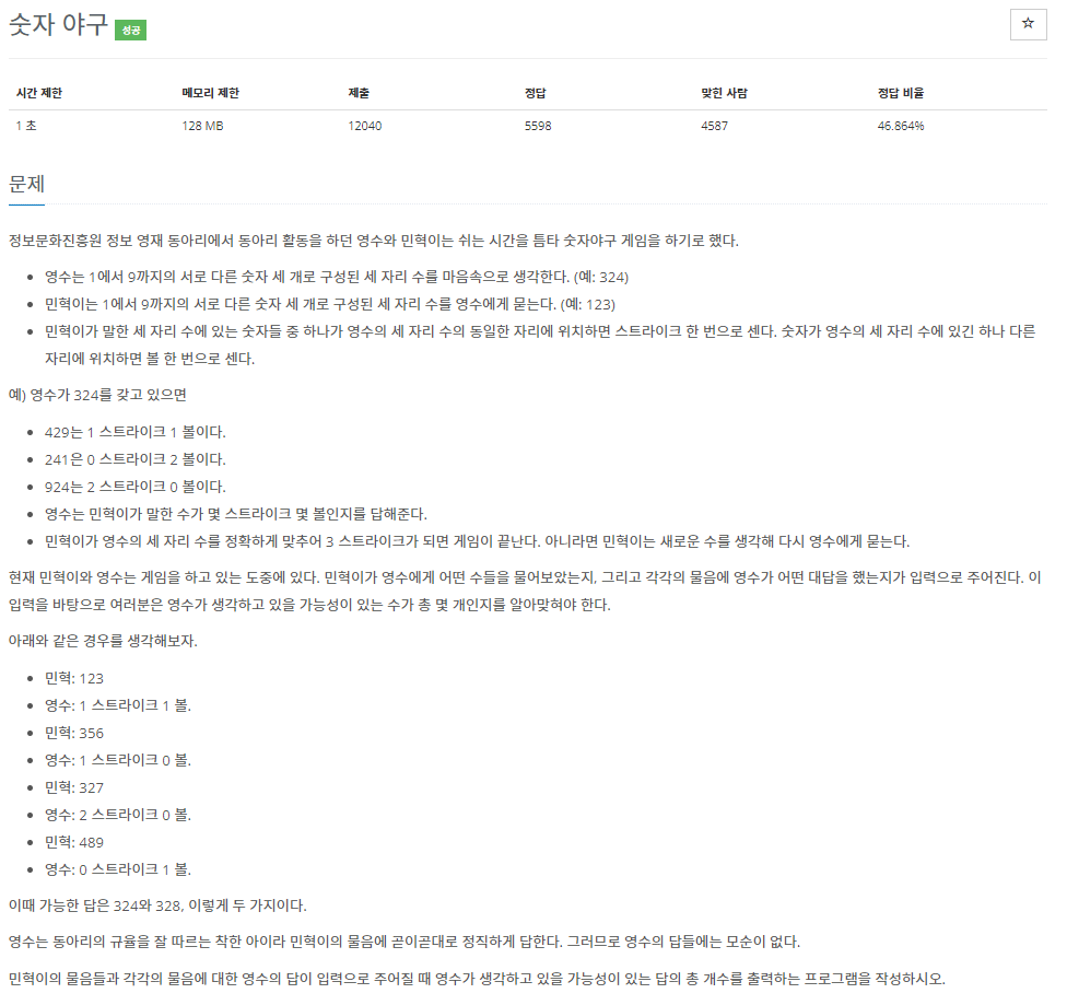 숫자를 string형으로 바꿔서 한 자리씩 비교를 했다. 만약 같으면 strike 수를 증가시키고, 다르면 다른 위치에 이 숫자가 존재하는지 확인하고 존재하면 ball 수를 증가시켰다.