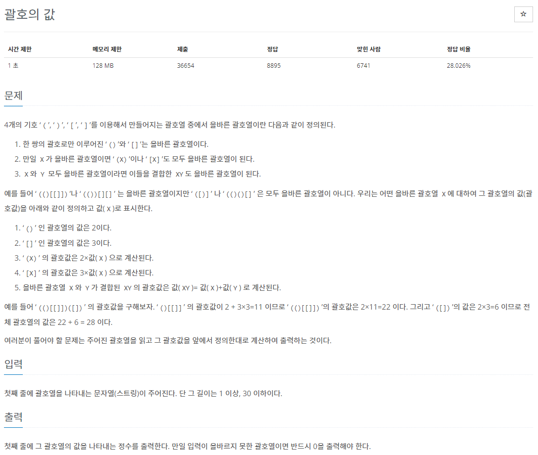 4개의 기호 ‘(’, ‘)’, ‘[’, ‘]’를 이용해서 만들어지는 괄호열 중에서 올바른 괄호열이란 다음과 같이 정의된다. 한 쌍의 괄호로만 이루어진 ‘()’와 ‘[]’는 올바른 괄호열이다. 만일