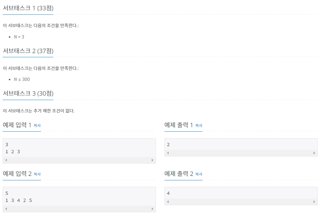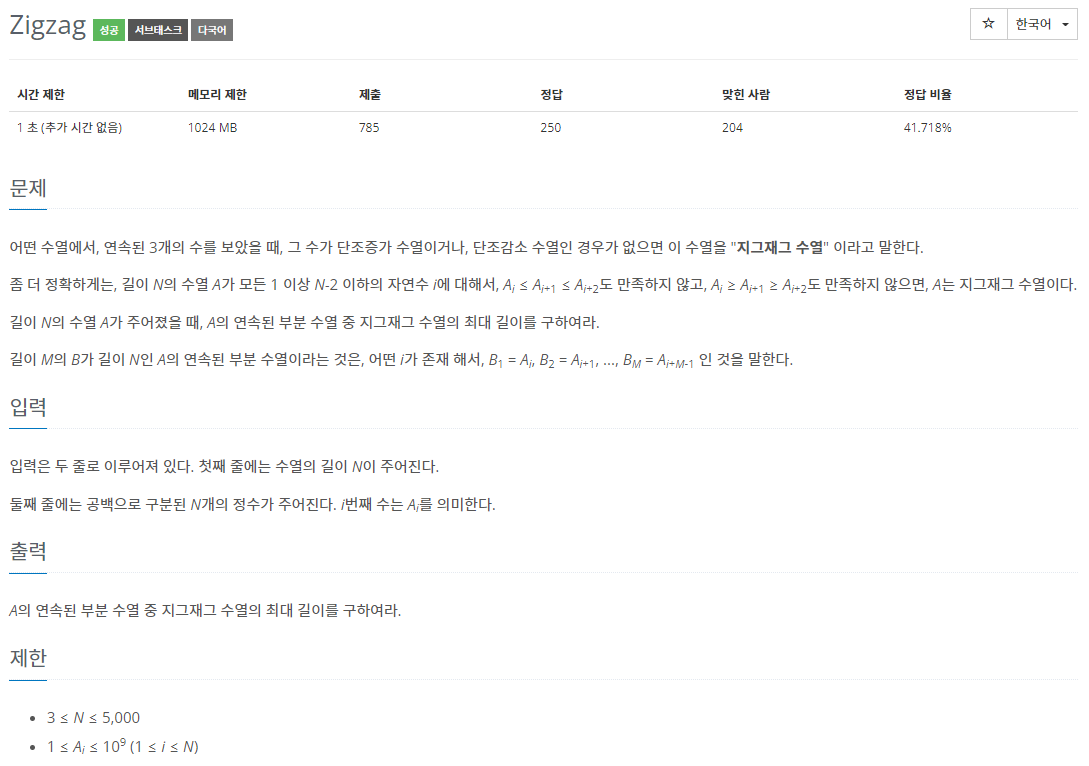 지그재그 수열을 만족하지 않는 경우 최소 수열의 길이는 2이다.