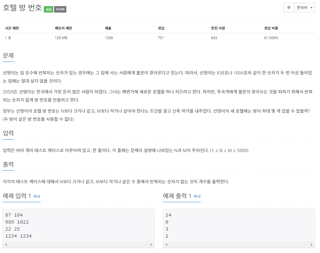 선영이는 집 호수에 반복되는 숫자가 있는 경우에는 그 집에 사는 사람에게 불운이 찾아온다고 믿는다. 따라서, 선영이는 838호나 1004호와 같이 한 숫자가 두 번 이상 들어있는 집에는 절대 살지