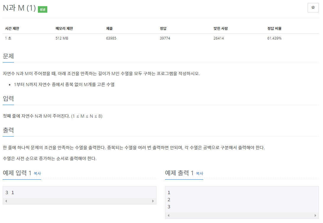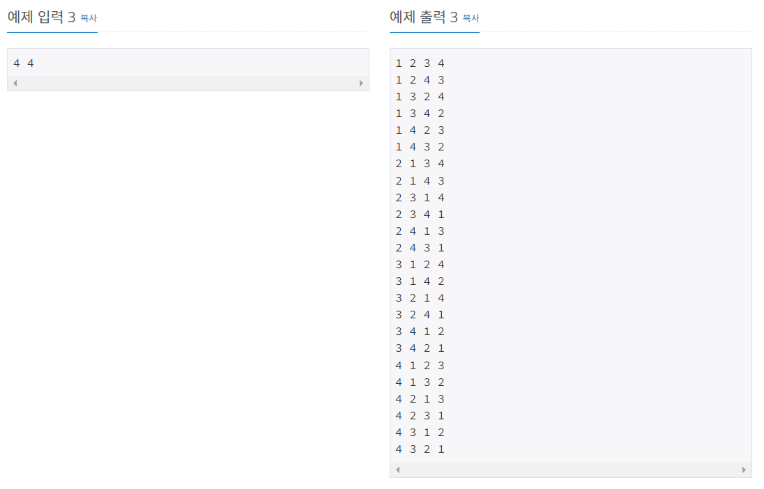 visit를 통해 이미 방문했는지 체크를 해줬고, s의 길이가 m과 같아질 때까지 s에 숫자를 넣어줬다. s를 출력해준 후에는 s.pop()을 통해 리스트에서 빼주고 visit를 다시 false로 바꿔준다.