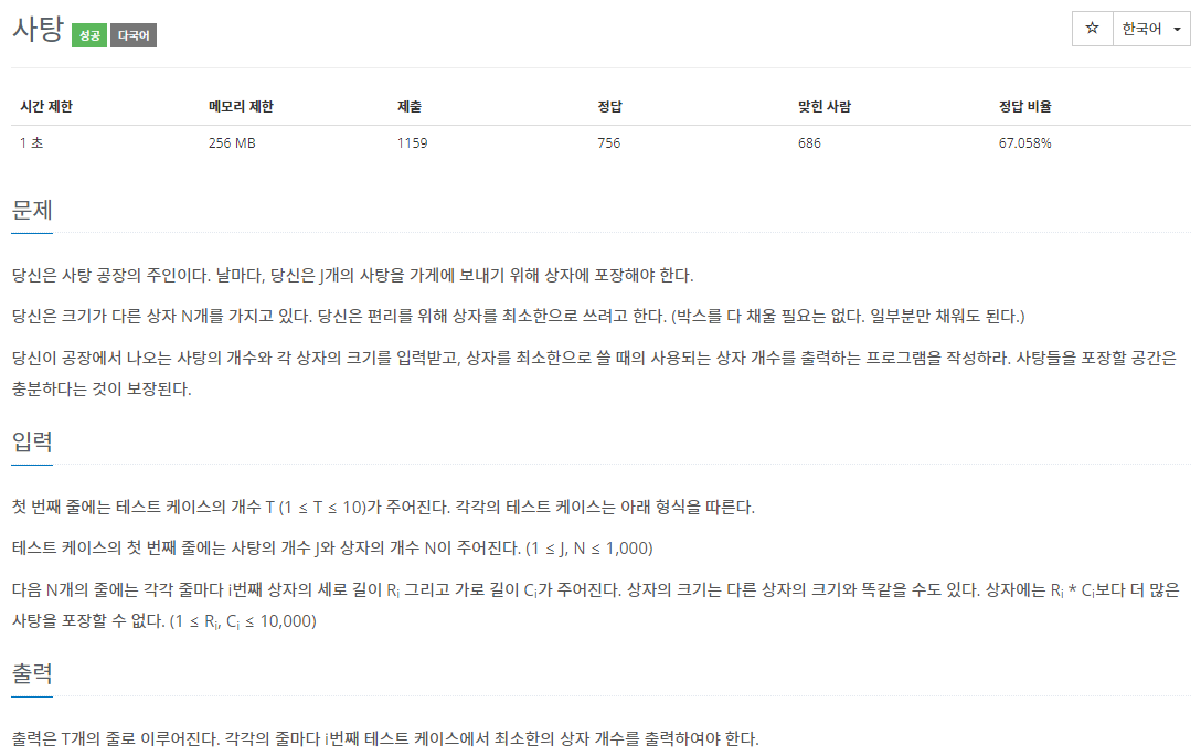 당신은 사탕 공장의 주인이다. 날마다, 당신은 J개의 사탕을 가게에 보내기 위해 상자에 포장해야 한다. 당신은 크기가 다른 상자 N개를 가지고 있다. 당신은 편리를 위해 상자를 최소한으로 쓰