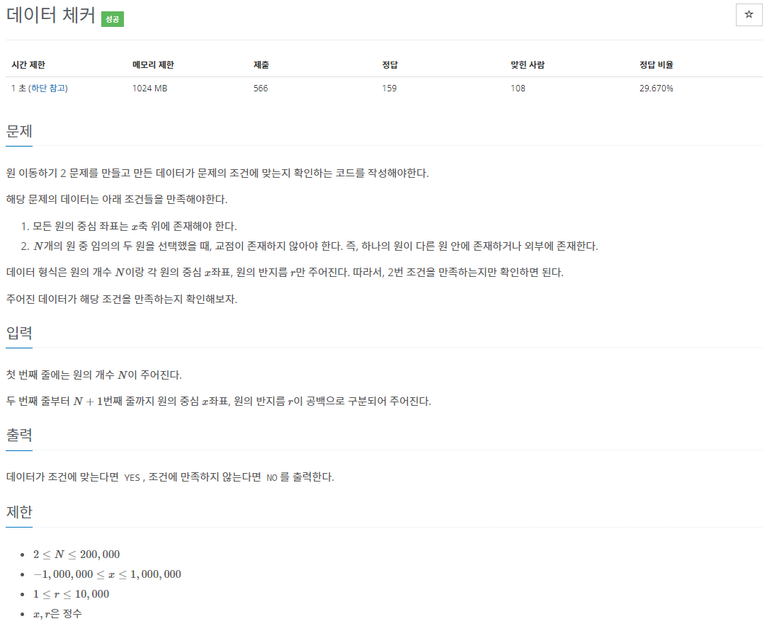 circle을 정렬시켜주고 for문을 이용하여 만약 현재 들어온 것이 원의 맨 앞이면(circle[i][2] == 0 이면) 스택에 push를 해준다. 만약 맨 뒤의 정보이면 스택에 있는 마지막 부분의 원 번호를 현재 정보와 비교하여 같으면 pop을 해주고, 다르면 서로 다른 원끼리 교점이 존재하는 것이기 때문에 NO를 출력해준다.