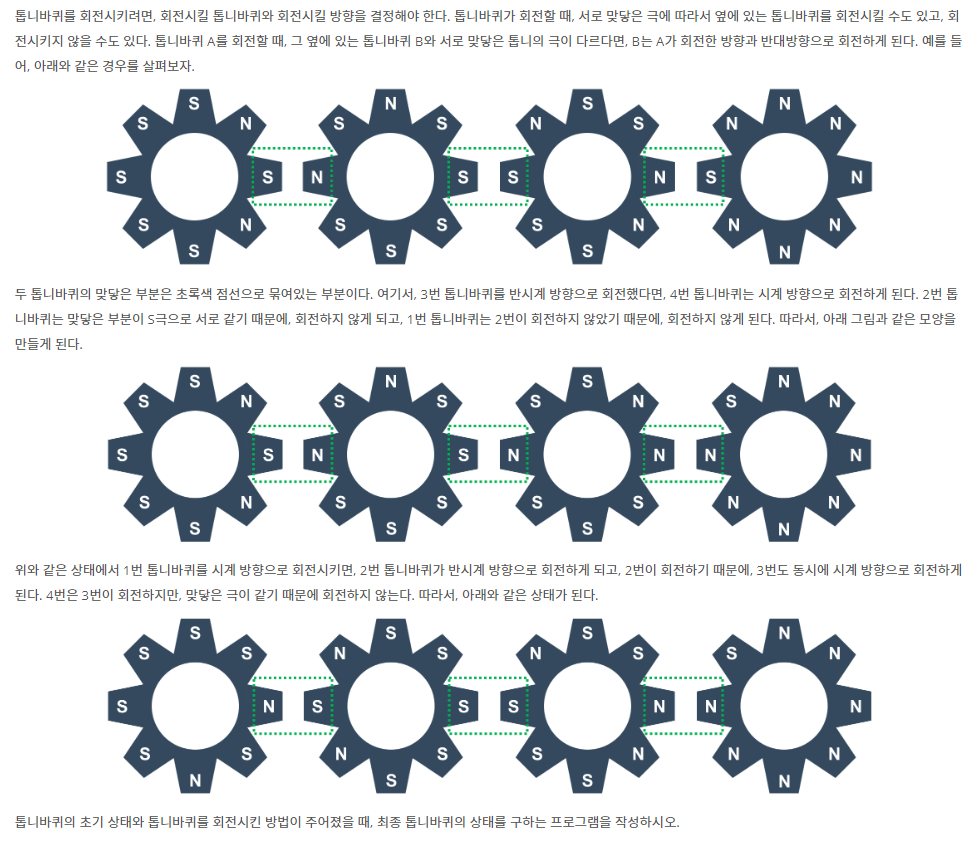 총 8개의 톱니를 가지고 있는 톱니바퀴 4개가 아래 그림과 같이 일렬로 놓여져 있다. 또, 톱니는 N극 또는 S극 중 하나를 나타내고 있다. 톱니바퀴에는 번호가 매겨져 있는데, 가장 왼쪽 톱니바퀴