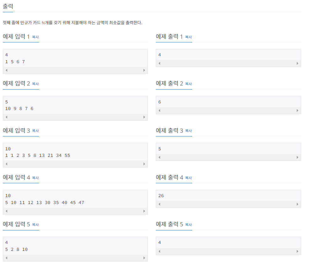 첫째 줄에 민규가 구매하려고 하는 카드의 개수 N이 주어진다. (1 ≤ N ≤ 1,000) 둘째 줄에는 Pi가 P1부터 PN까지 순서대로 주어진다. (1 ≤ Pi ≤ 10,000)
