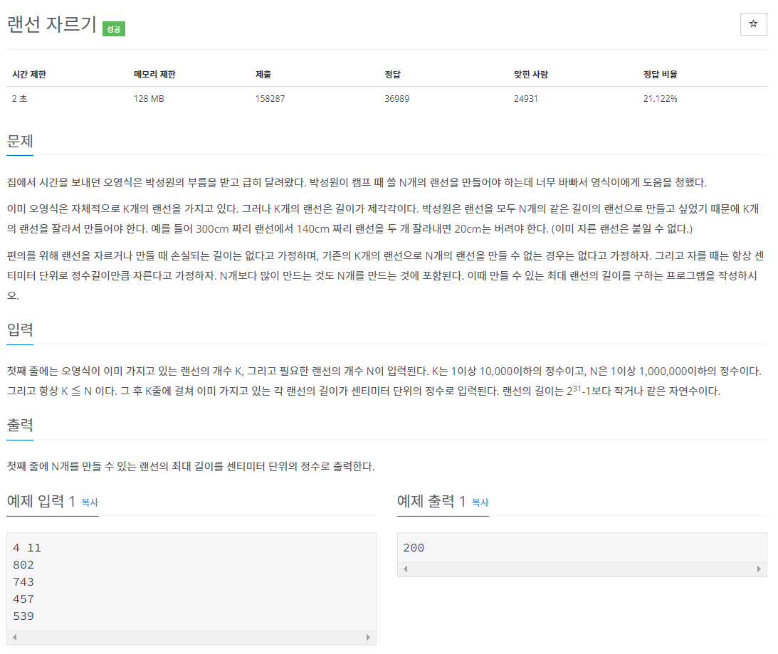첫째 줄에는 오영식이 이미 가지고 있는 랜선의 개수 K, 그리고 필요한 랜선의 개수 N이 입력된다. K는 1이상 10,000이하의 정수이고, N은 1이상 1,000,000이하의 정수이다. 그리고 항상 K ≦ N 이다. 그