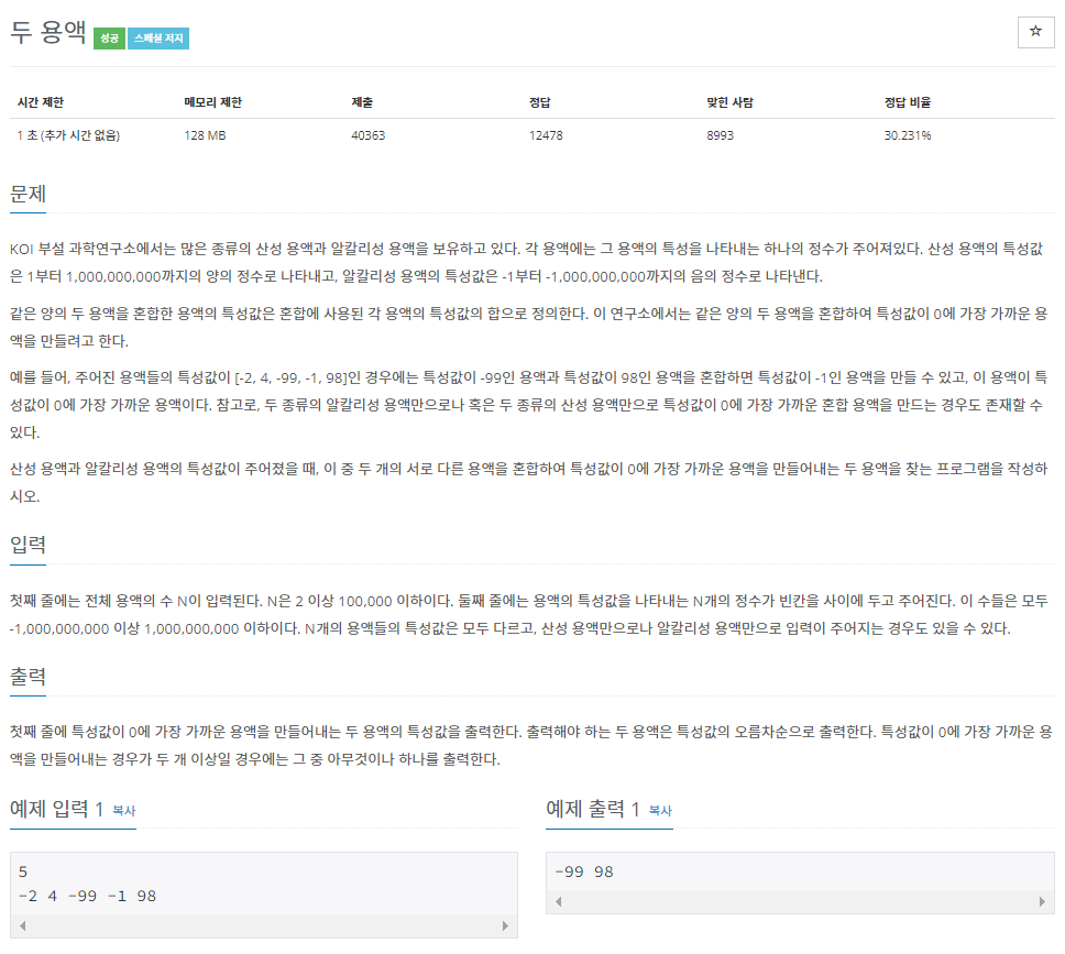 양 끝에서부터 시작해서 두 수를 더한 값의 절댓값이 0이면 바로 while문을 빠져나와 답을 출력하고, 현재 최솟값보다 작으면 answer에 두 수를 저장하고 min_n 값도 갱신했다.
