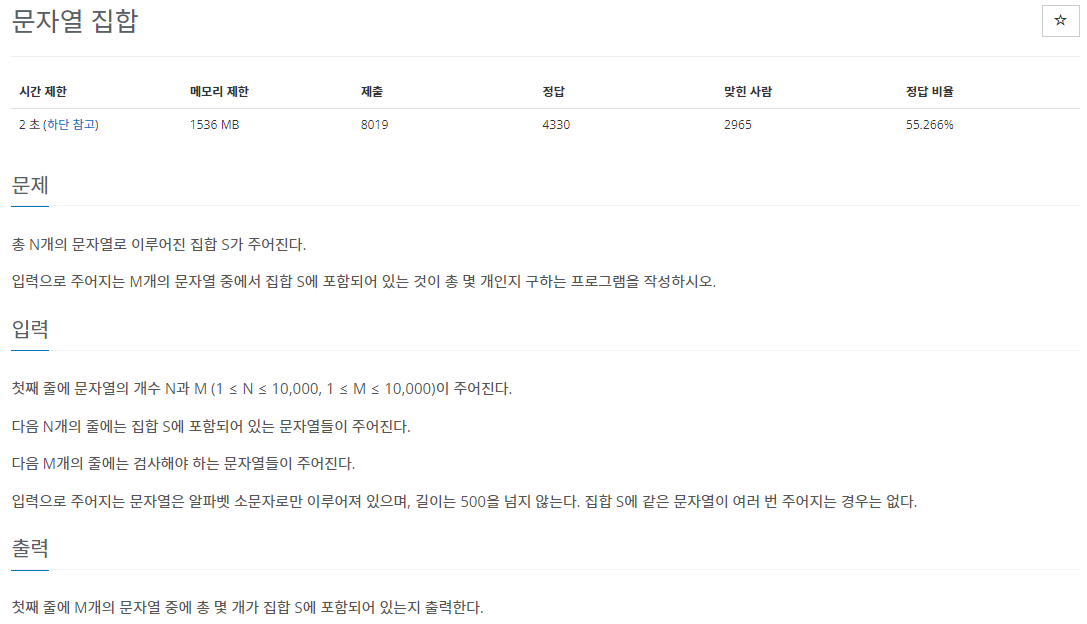 첫째 줄에 문자열의 개수 N과 M (1 ≤ N ≤ 10,000, 1 ≤ M ≤ 10,000)이 주어진다. 다음 N개의 줄에는 집합 S에 포함되어 있는 문자열들이 주어진다. 다음 M개의 줄에는 검사해야 하는 문자열들이 주어