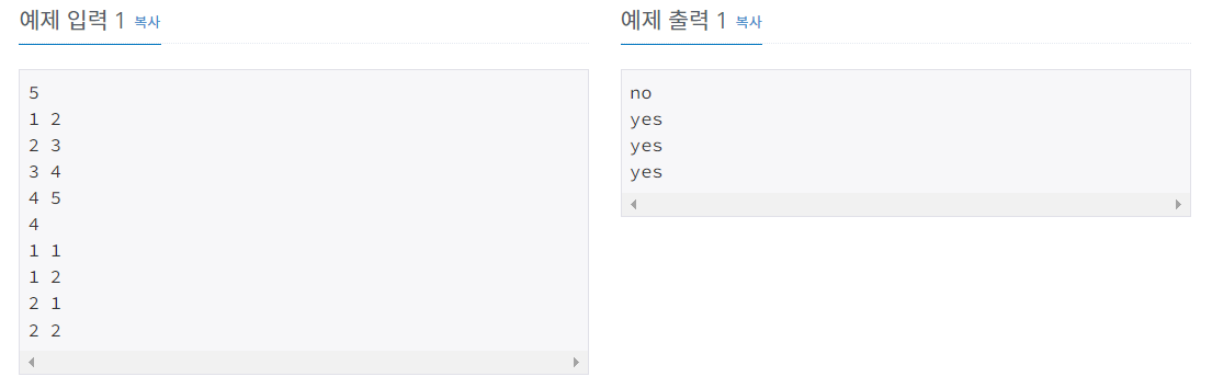 일단 모든 간선은 단절선이다. 왜냐하면 모든 간선은 노드 2개를 연결하고 있어서 간선을 지우면 트리가 무조건 최소 2개로 나뉘기 때문이다. 따라서 t가 2일 때는 무조건 yes를 출력하게 했다.