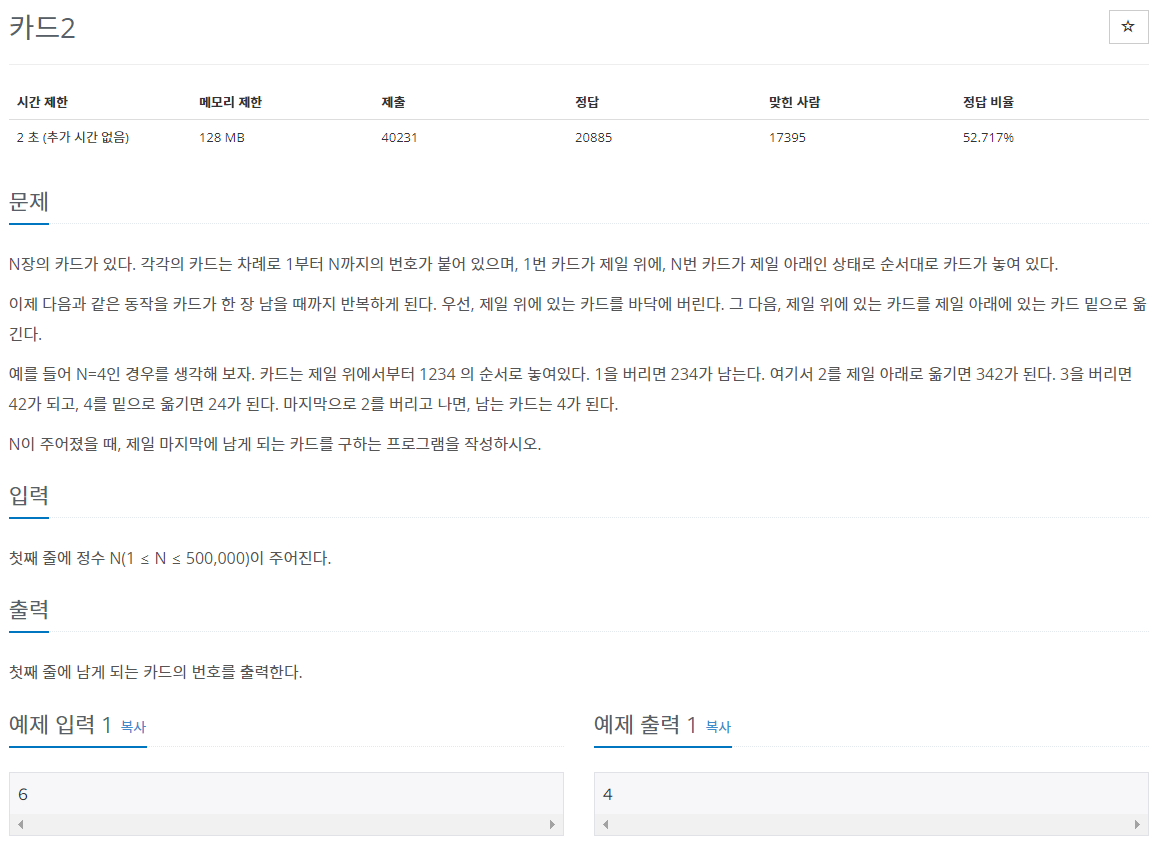 N장의 카드가 있다. 각각의 카드는 차례로 1부터 N까지의 번호가 붙어 있으며, 1번 카드가 제일 위에, N번 카드가 제일 아래인 상태로 순서대로 카드가 놓여 있다. 이제 다음과 같은 동작을 카드가