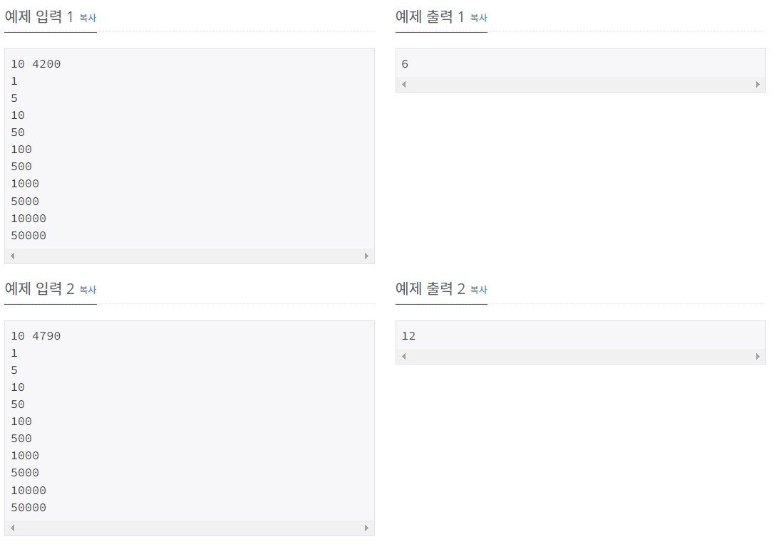 첫째 줄에 N과 K가 주어진다. (1 ≤ N ≤ 10, 1 ≤ K ≤ 100,000,000) 둘째 줄부터 N개의 줄에 동전의 가치 Ai가 오름차순으로 주어진다. (1 ≤ Ai ≤ 1,000,000, A1 = 1, i ≥ 2인 경우에 Ai는 Ai-1의 배수)