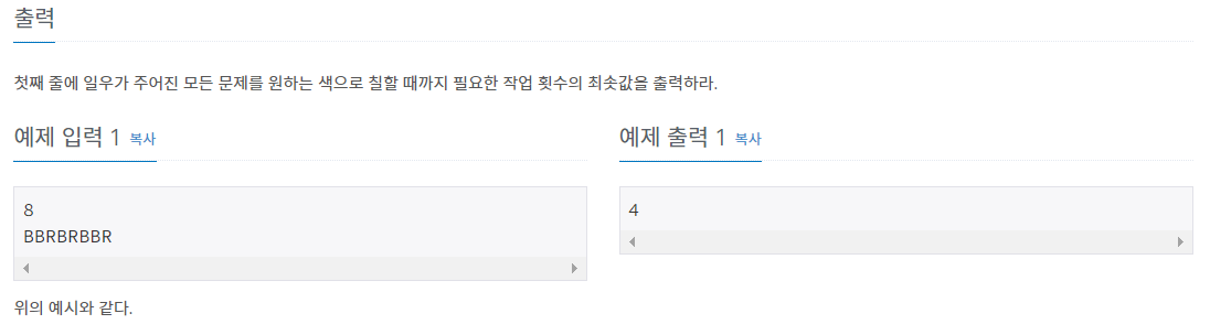 빨간색으로 모든 문제를 칠하고 나중에 파란색을 칠하는 횟수와, 파란색으로 모든 문제를 칠하고 나중에 빨간색을 칠하는 횟수 중 더 작은 값을 출력해주면 된다.