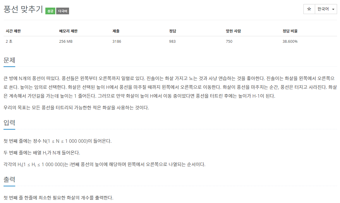 발사된 화살의 위치를 배열을 이용하여 표시해주었다. 만약 주어진 풍선의 높이에 화살이 존재하면 배열에서 화살의 위치를 바꿔준다.