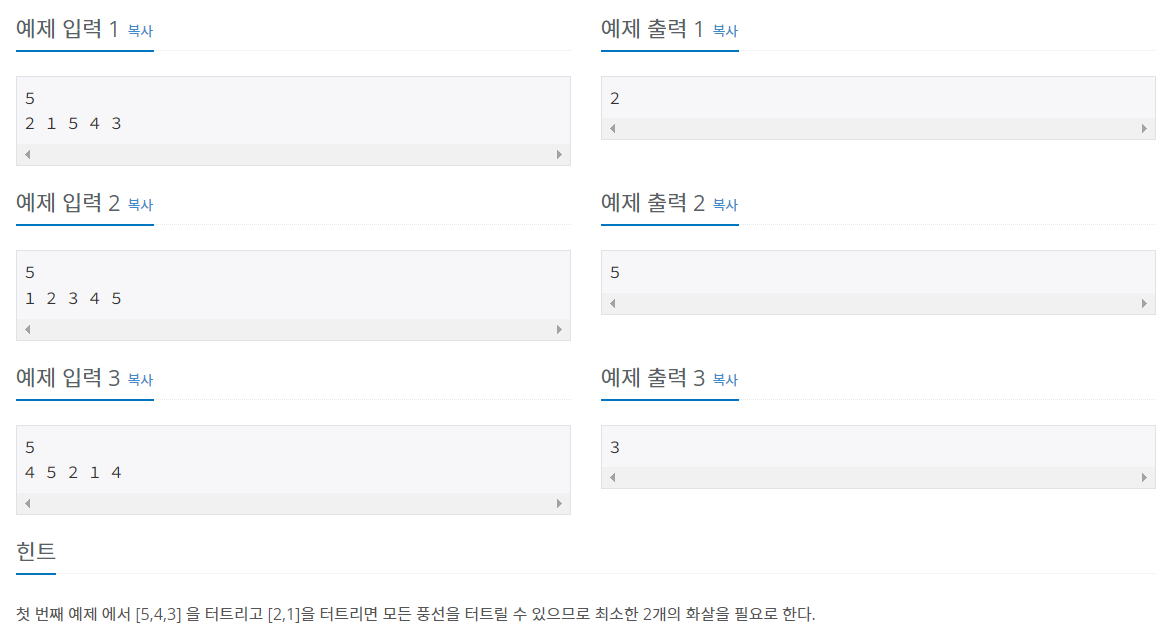 첫 번째 예제 에서 [5,4,3] 을 터트리고 [2,1]을 터트리면 모든 풍선을 터트릴 수 있으므로 최소한 2개의 화살을 필요로 한다.