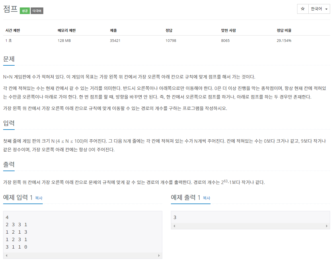 dp[i][j]에 방문 횟수를 저장해서 마지막 dp[n-1][n-1]의 방문 횟수를 출력하는 방법을 사용했다.