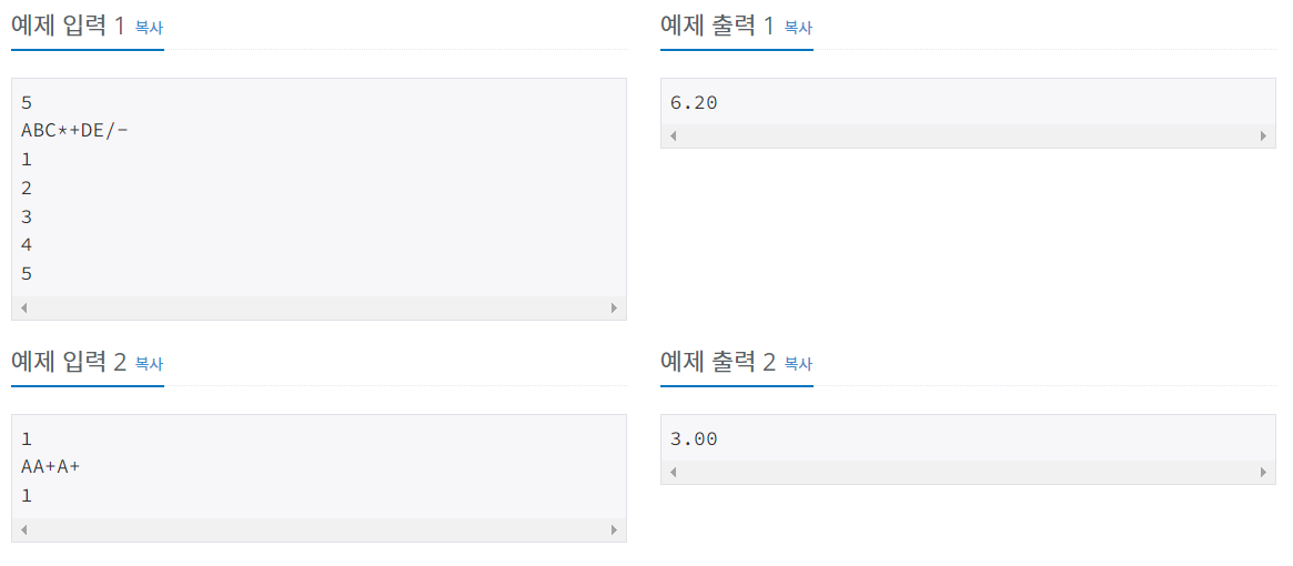 첫째 줄에 피연산자의 개수(1 ≤ N ≤ 26) 가 주어진다. 그리고 둘째 줄에는 후위 표기식이 주어진다. (여기서 피연산자는 A~Z의 영대문자이며, A부터 순서대로 N개의 영대문자만이 사용되며, 길이
