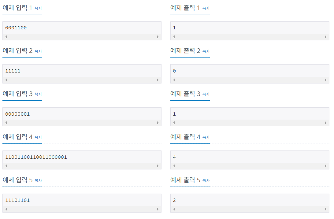 다솜이는 0과 1로만 이루어진 문자열 S를 가지고 있다. 다솜이는 이 문자열 S에 있는 모든 숫자를 전부 같게 만들려고 한다. 다솜이가 할 수 있는 행동은 S에서 연속된 하나 이상의 숫자를 잡고 모