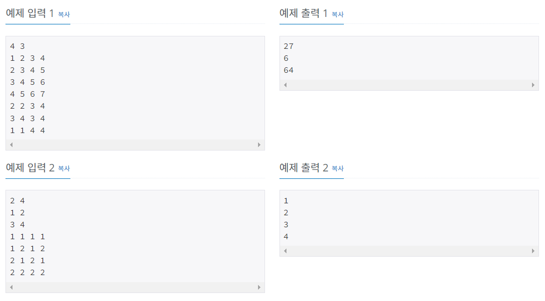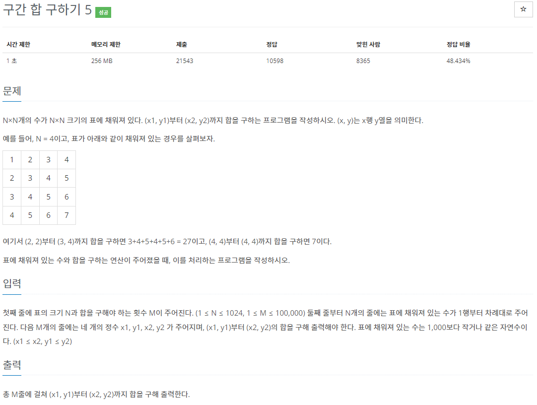 첫째 줄에 표의 크기 N과 합을 구해야 하는 횟수 M이 주어진다. (1 ≤ N ≤ 1024, 1 ≤ M ≤ 100,000) 둘째 줄부터 N개의 줄에는 표에 채워져 있는 수가 1행부터 차례대로 주어진다. 다음 M개의 줄에는 네