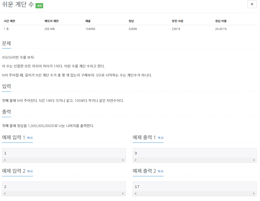 10844번: 쉬운 계단 수