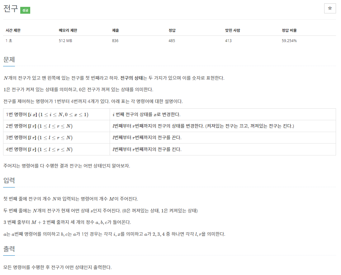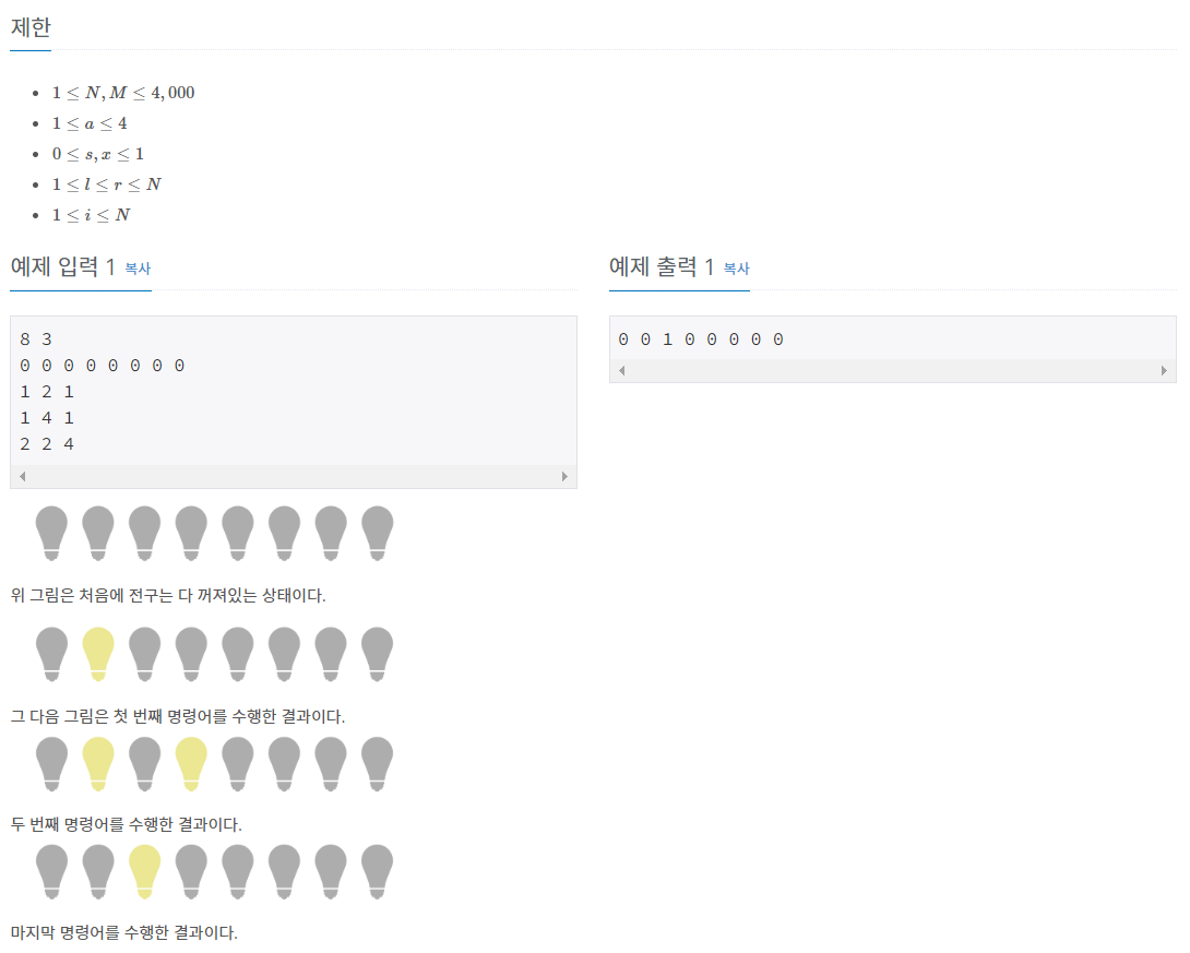 $N$개의 전구가 있고 맨 왼쪽에 있는 전구를 첫 번째라고 하자. 전구의 상태는 두 가지가 있으며 이를 숫자로 표현한다. $1$은 전구가 켜져 있는 상태를 의미하고, $0$은 전구가 꺼져 있는 상태를